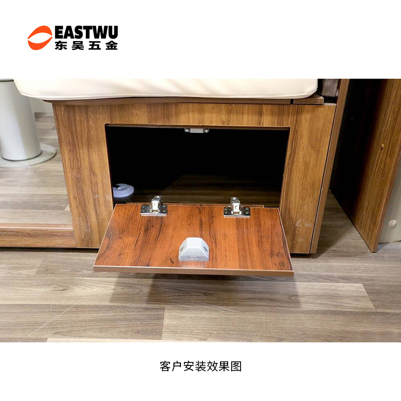 冷轧钢房车吊柜缓冲铰链 静音缓冲 免开孔 无需加装气撑 柜门自动撑起 适用门厚15-40mm 开启角度170° 使用范围房车吊柜、衣柜等